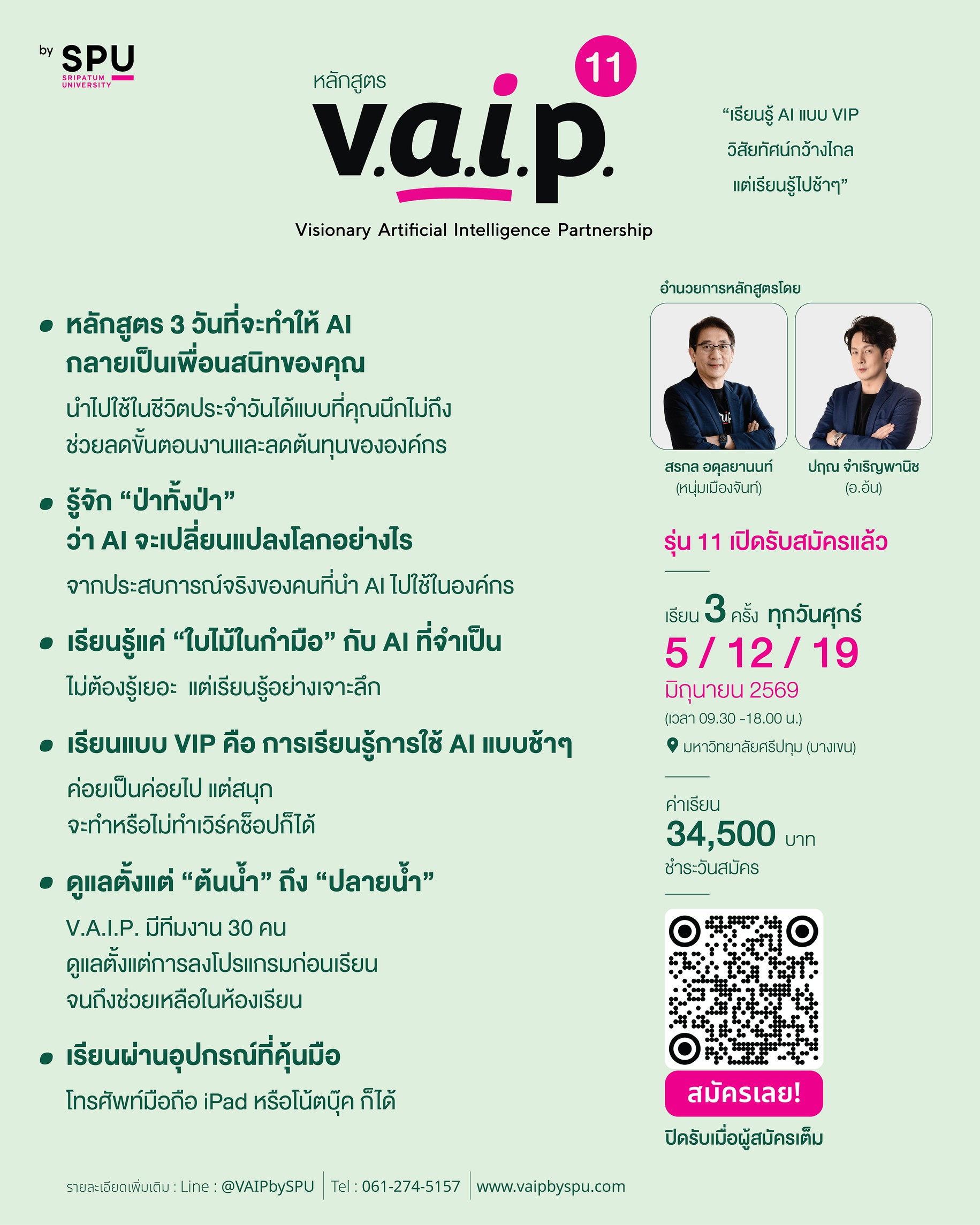 อยากเรียนรู้ในคลาสที่มีคนคอยดูแลแบบใส่ใจ เรียนจบแล้วเป็นคนทันโลกที่เปลี่ยนแปลงอย่างรวดเร็ว ส่วนใหญ่ถนัดใช้มือถือ หรือ iPad มากกว่า Computer หรือ Notebook แต่ต้องการปรับตัว และใช้ประโยชน์จาก AI เพื่อสร้างความได้เปรียบทางธุรกิจแบบเข้าใจง่าย ทำเองได้จริง สั่งและบริหารงานทีมงานเป็น พัฒนาองค์กรได้ทันโลก ทันสถานการณ์